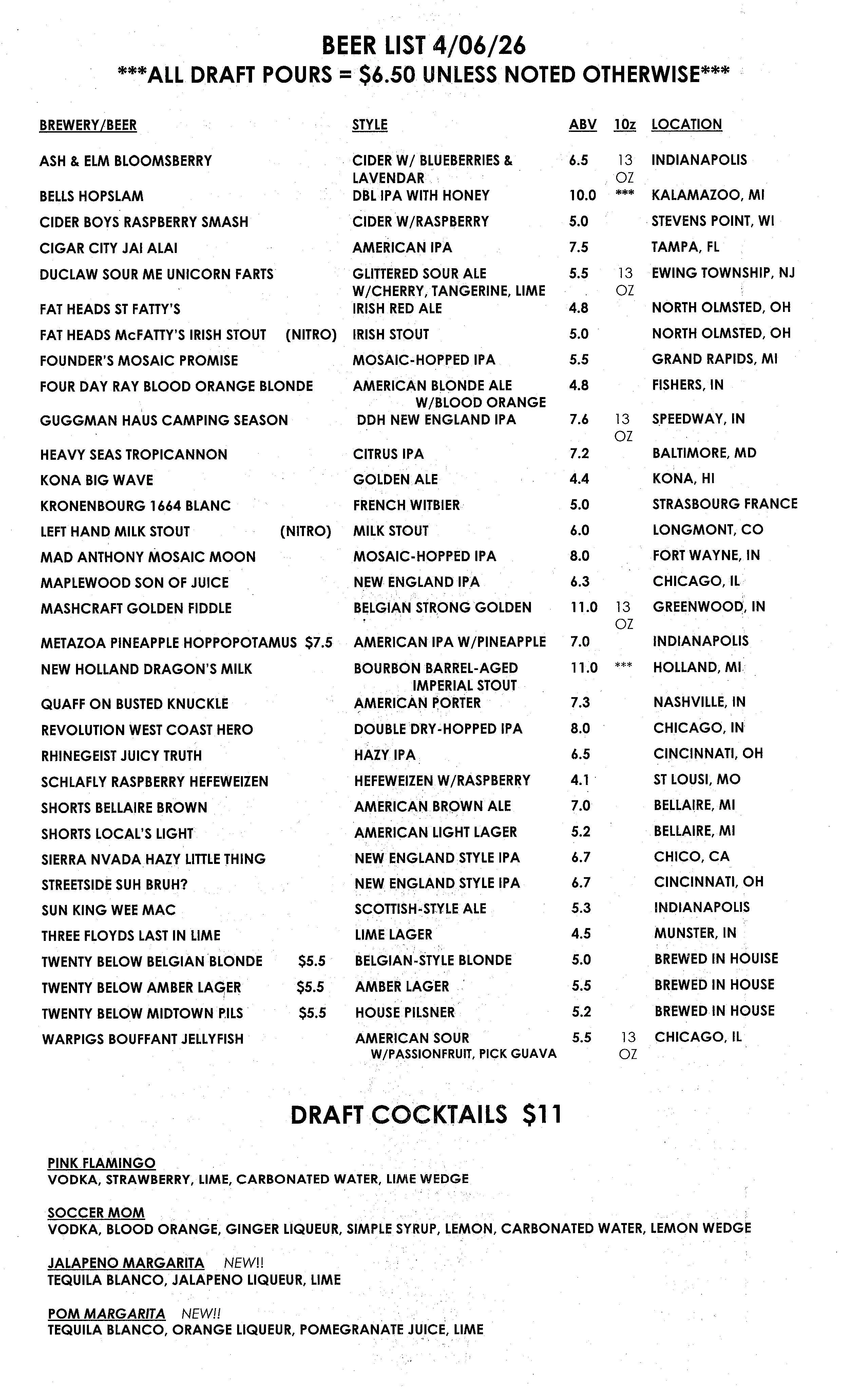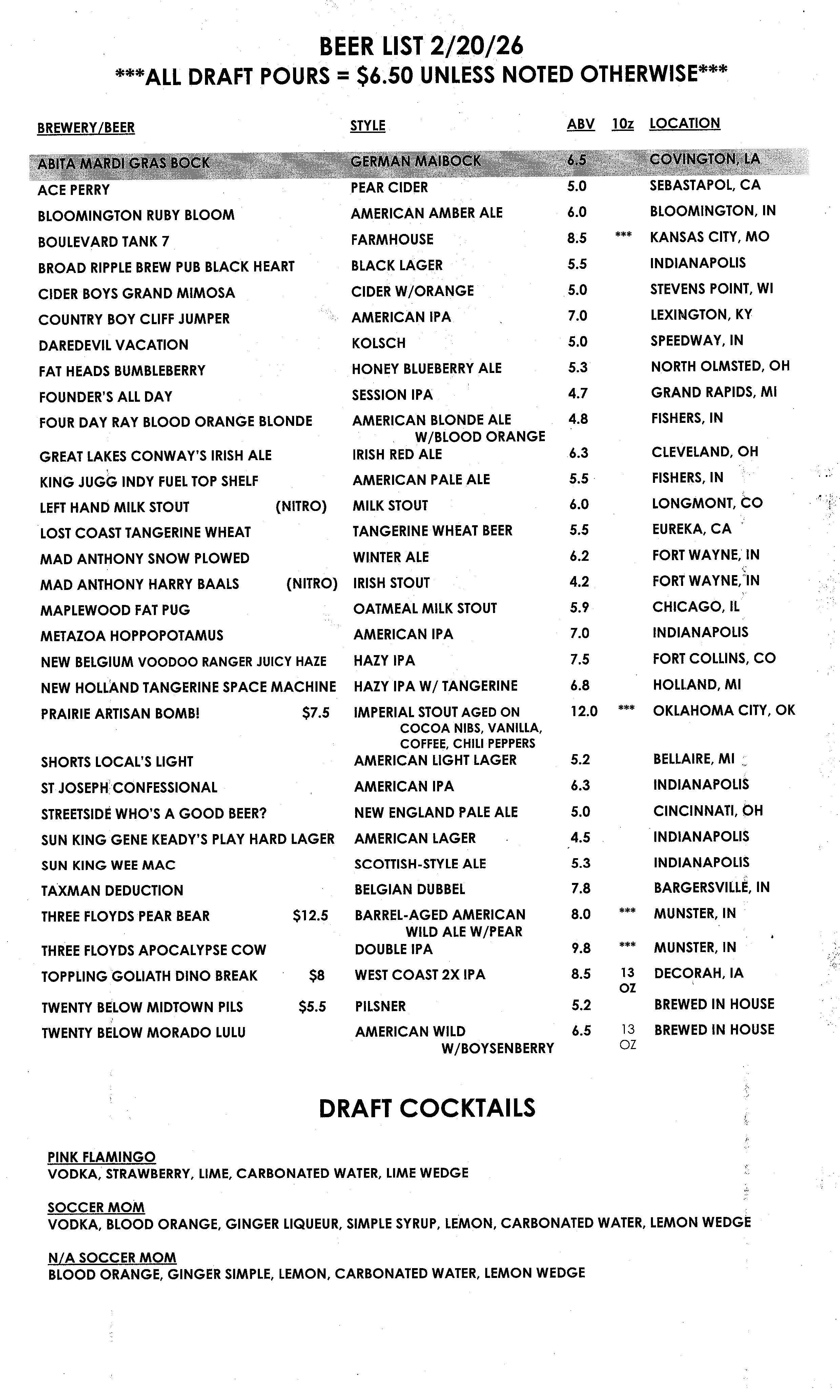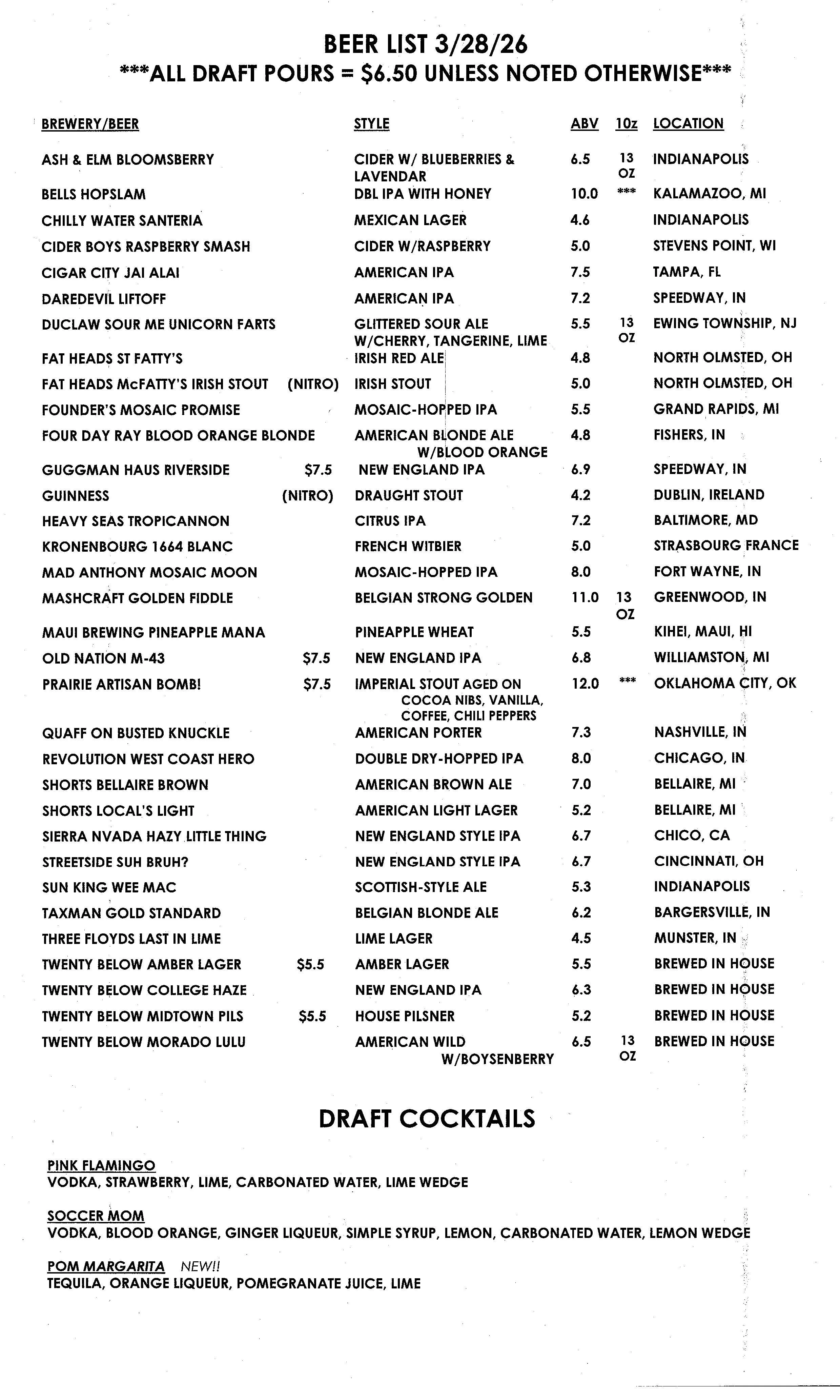 Our beers on tap rotate frequently and we post new menus weekly! To learn more about our in-house brewery, 20 Below, click
